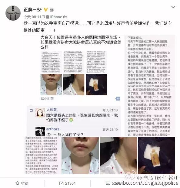 之后,被害人躲进车内,让不远处倒垃圾的工人叫来保安,用保安的手机再一次报警。事后,网友“大圆-上海松江”进行了验伤。