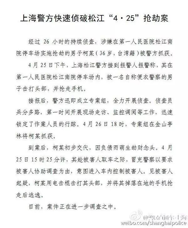 据上海公安局官方微博信息,4月25日下午,上海松江警方接到报警,称在上海市第一人民医院松江南院停车场内,被害人被一名自称便衣警察的男子击打头部,并抢走手机。