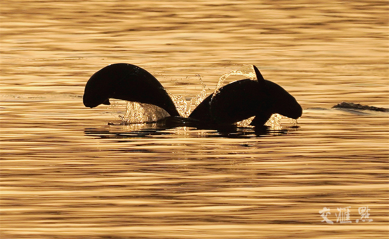 2024年5月17日,长江南京段,两头长江江豚在夕阳下跳跃嬉戏,构成美丽的“生态花朵”。蒋宁摄 视觉江苏网供图