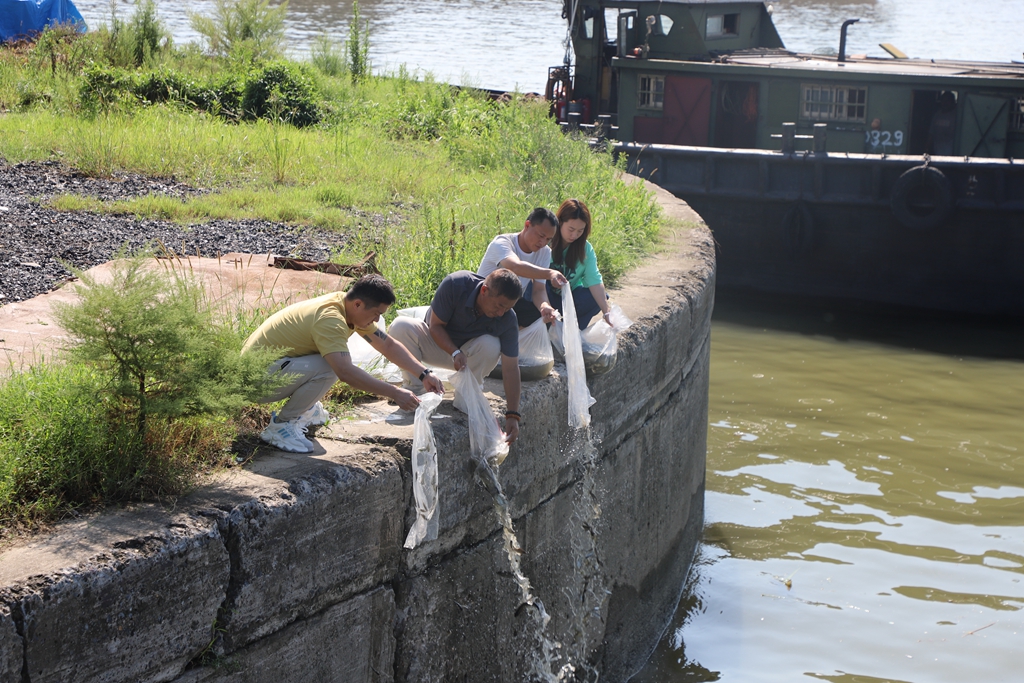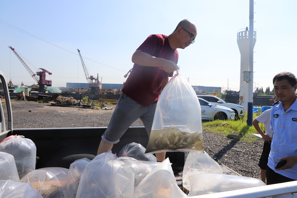 9月15日上午,在长江焦港段,来自靖江市智琛港务有限公司的工作人员在堤岸放生了1万尾鱼苗。
