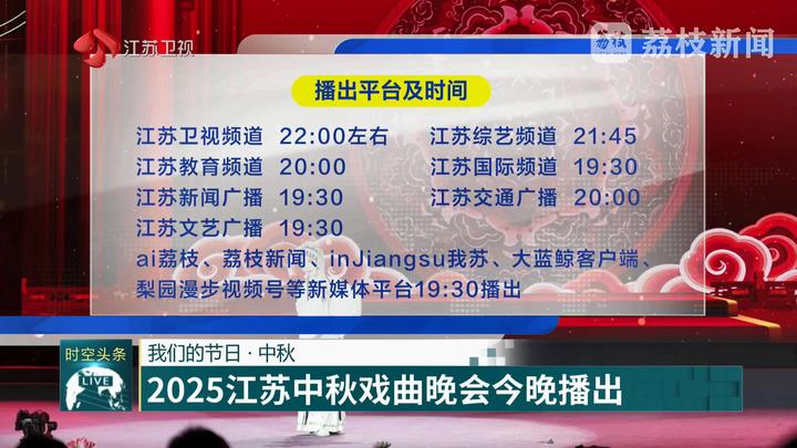 由江苏省委宣传部指导,省广播电视总台、省演艺集团主办的《2025江苏中秋戏曲晚会》将于今晚在江苏广电总台多个频道、频率及新媒体平台同步播出。