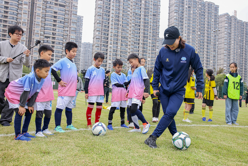 走进靖江市体育中心绿茵场,周高萍俯身示范带球动作,指点青训小球员的技术细节。随后,在参观长江文化客厅、靖江图书馆新馆后,“一黑到底·跃马苏超”青聚沙龙随即展开,周高萍一行分享“苏超”元年夺冠历程与心路感悟,青年朋友踊跃提问,互动热烈。
