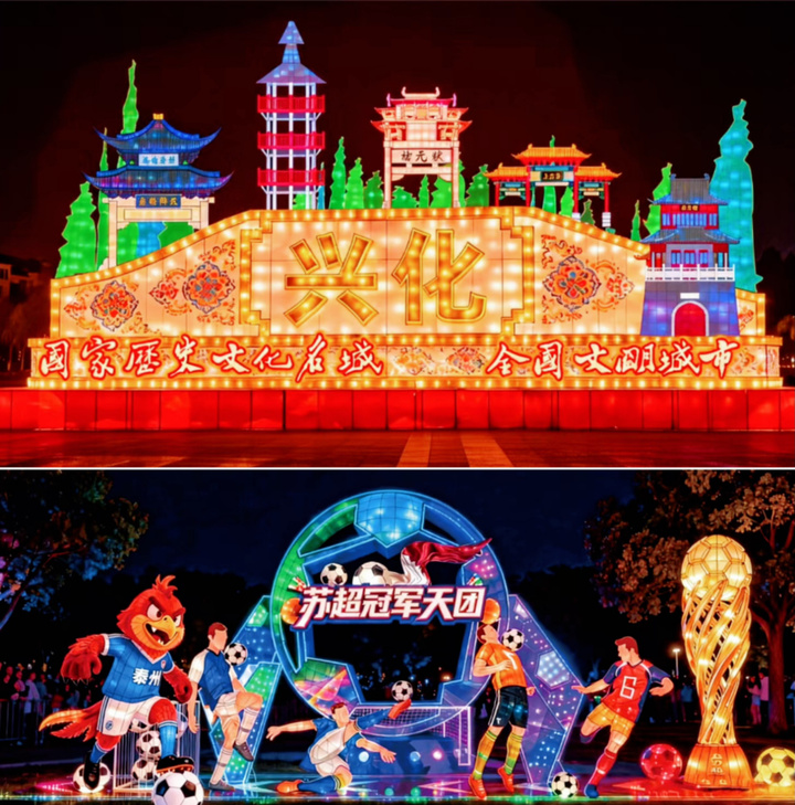 看点:南侧的花灯海洋堪称最大惊喜——水浒英雄、水墨泰州、苏超天团、肥美的大闸蟹、奔腾的骏马……每一盏都藏着兴化的专属故事。“祈福、赐福、纳福、福成”四大板块贯穿全场,千灯许愿、财神巡游、鱼灯舞、国风古典舞、狮王争霸轮番上演,6处舞台边走边看,全天超百场演出,彻底告别“意犹未尽”的感觉。