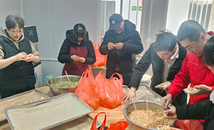 而在项目部食堂里,一场热热闹闹的包饺子活动正在进行。队机关职工们特意赶来,与一线兄弟们围站在餐桌旁,各显身手。经验丰富的老职工耐心指导着年轻小伙,形态各异的饺子摆满餐盘,包进去的不仅是肉馅,更是平安顺遂、阖家幸福的美好祝愿。