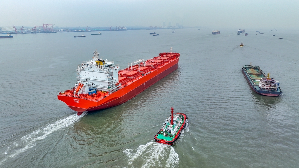 其中,“新扬子538”是扬子江船业集团新扬子造船为英国船东建造的油船,总长248.8米、型宽44米、型深21.5米,水面以上最大高度达40.05米,是全球首制的11.4万载重吨风力辅助推进双燃料油轮,在风帆有效运行中,日均可节约5%~10%的油耗,减少碳排放的同时有效提升船舶运营效能。“新扬子539”是新扬子造船为挪威船东建造的烧碱和散货混装两用船,总长228.4米,型宽34.8米,型深20.9米,水面以上最大高度39米,未来将投身全球大宗商品运输领域。