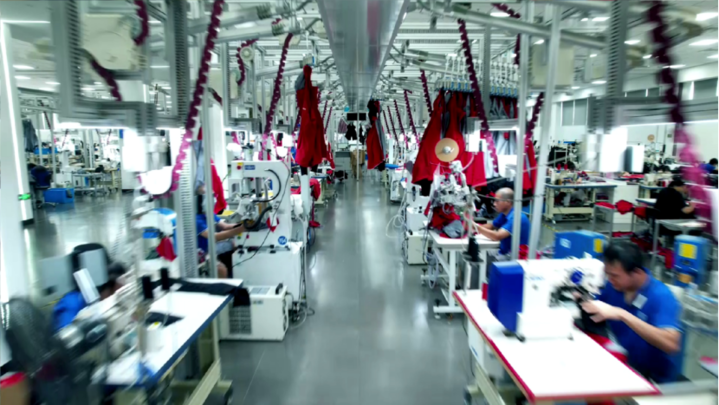 “生产车间关键环节的自动化率达到90%以上,自动裁剪机、自动充绒机都是和系统互联互通的。”波司登智能制造生产基地厂长赖和东介绍,现在的吊挂总装线采用双轨输送,可以对有需要优先生产的产品优先排单,通过数字化、智能化帮助企业更精准、更高效地满足消费者需求。